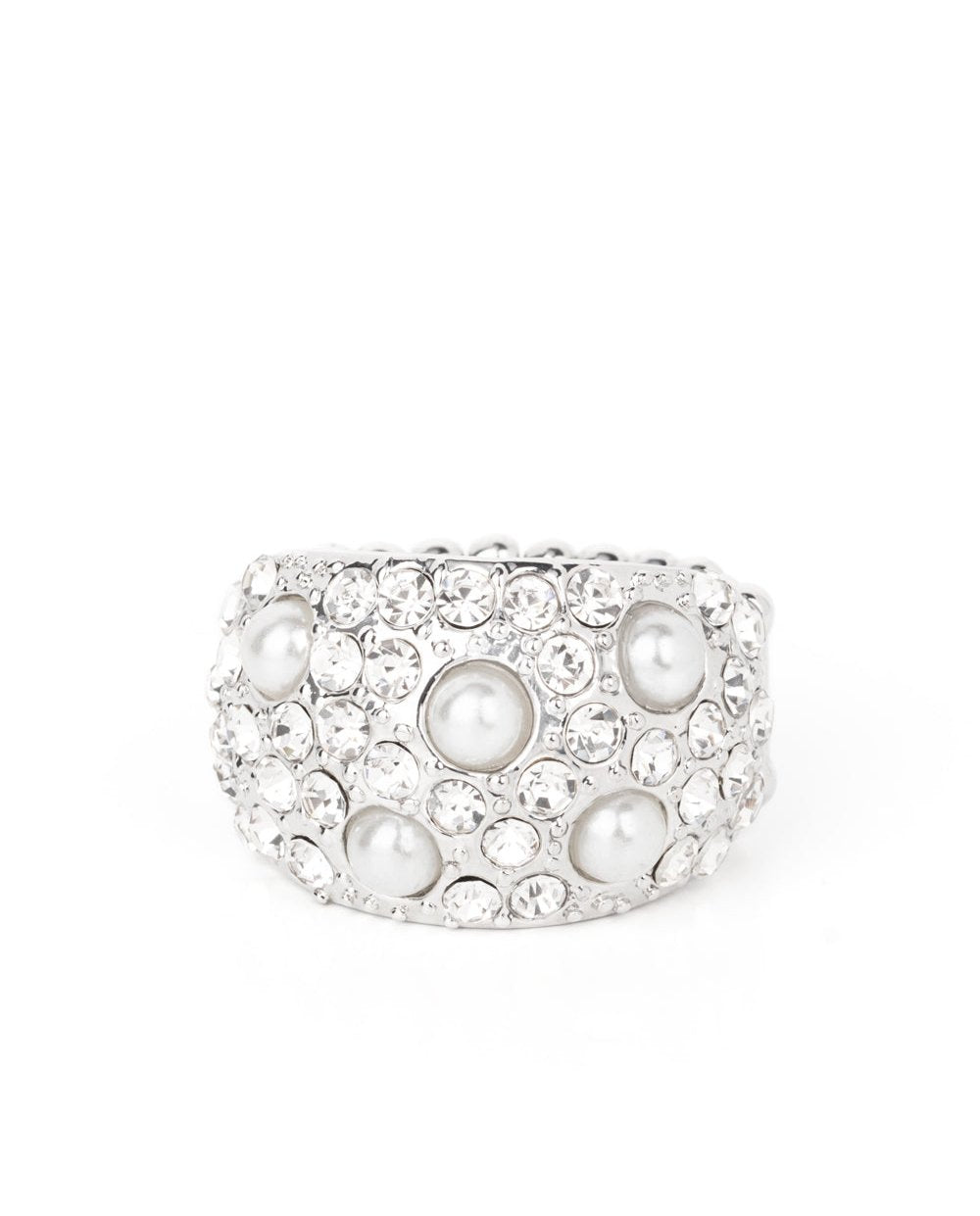 An explosion of dainty white rhinestones and bubbly white pearls are encrusted across the front of a thick silver band, creating a glamorous centerpiece atop the finger. Features a stretchy band for a flexible fit.