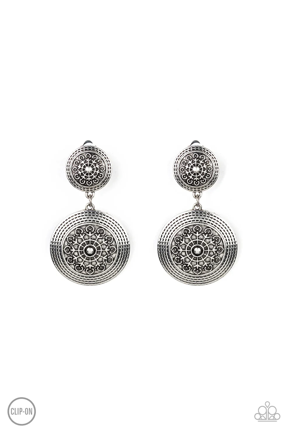 Dotted with studded centers, two flowery silver medallion-like frames link into a whimsical lure. Earring attaches to a standard clip-on fitting.