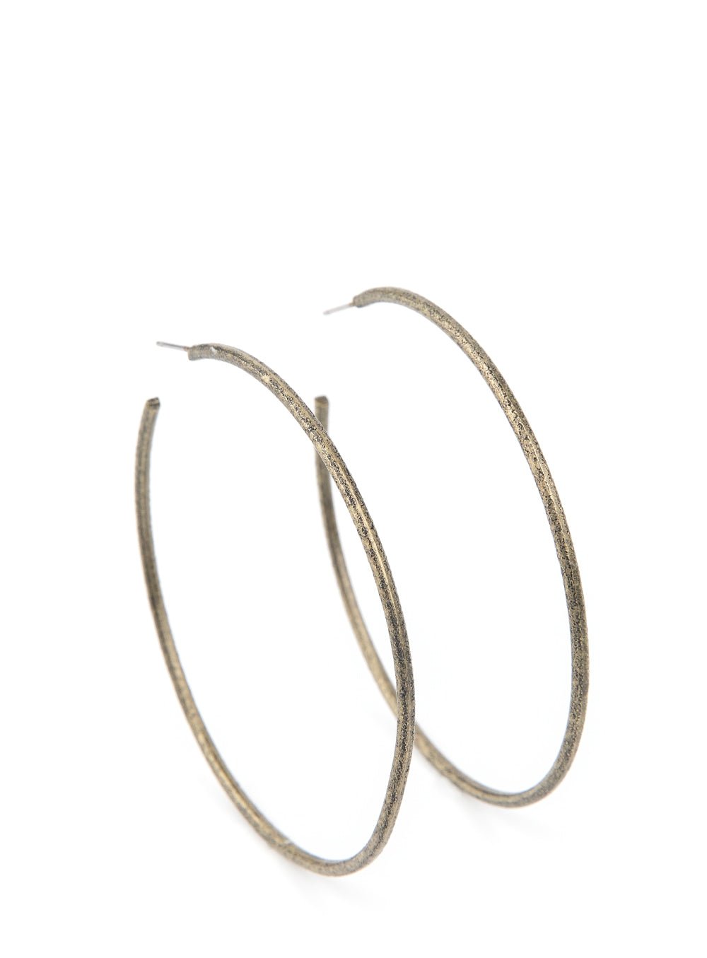 Delicately hammered in antiqued textures, a burnished brass bar curves into an oversized hoop for a rustic look. Earring attaches to standard post fitting. Hoop measures approximately 2 1/2" in diameter.